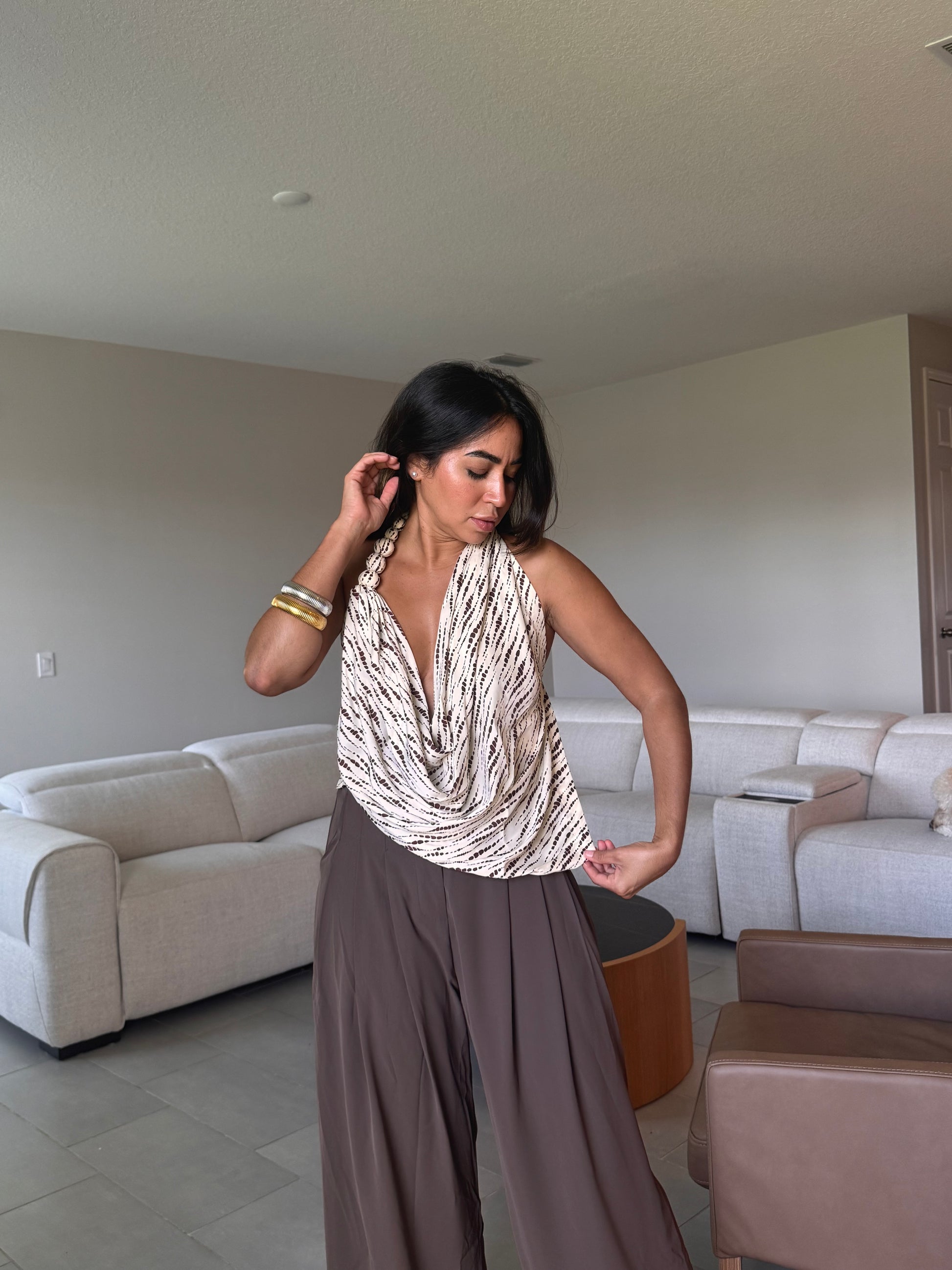 Alluring yet graceful! This top is designed to turn heads from every angle. In a soft ivory and mocha palette, its daring open back drapes beautifully. At the front, has a beautiful detail of spheres in the collar, and asymmetrical fit. Runs true to size. Model is wearing size small. 95% polyester, 5% spandex.