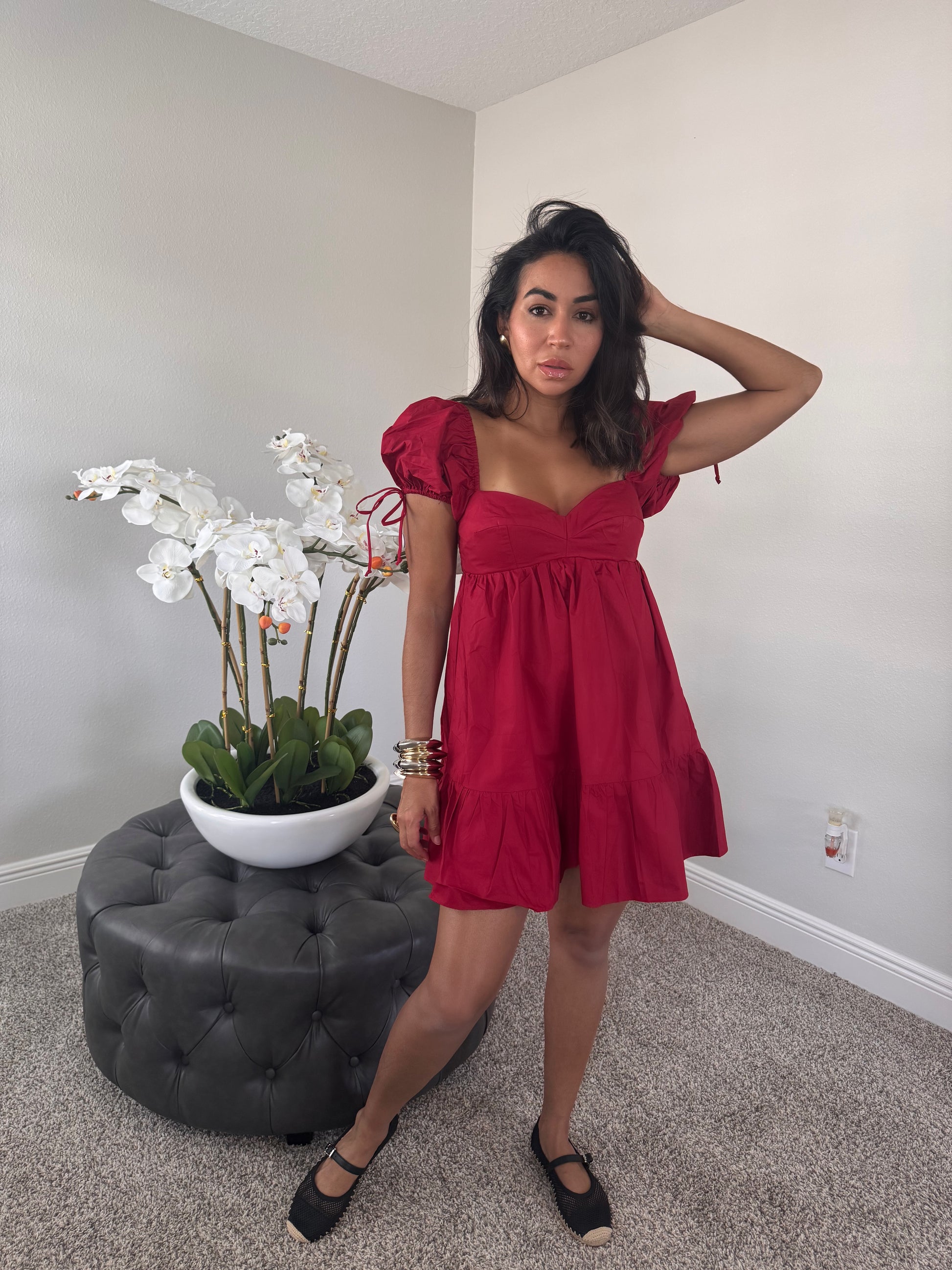 Cute and feminine, the Crimson Bloom captures the beauty of confidence in motion. With its sweetheart neckline, puff elastic sleeves with dainty ties, and a tiered mini skirt, it's a romantic statement! With elastic band at the back. Two colors. Runs true to size. Model is wearing size small. 100% cotton.