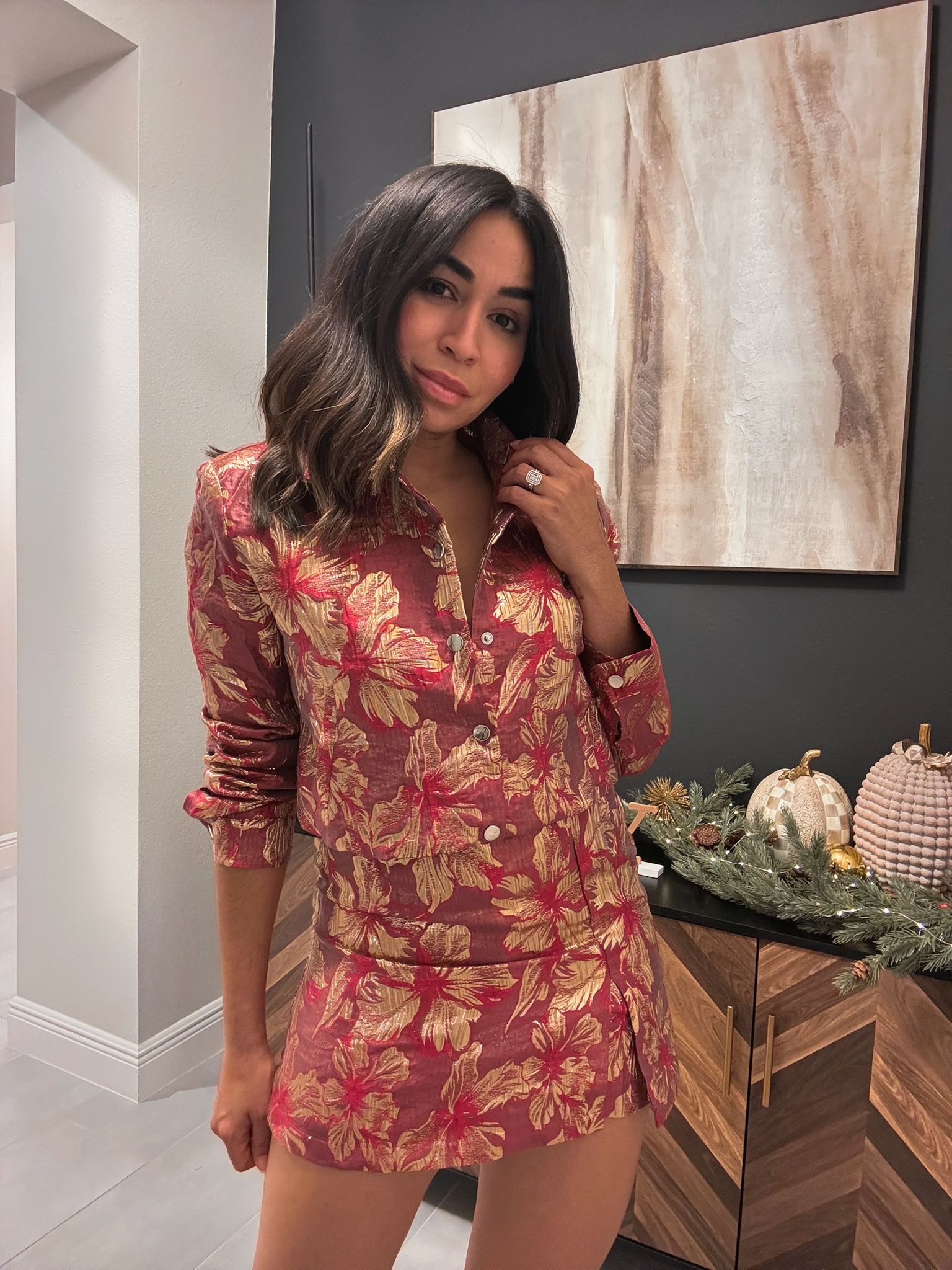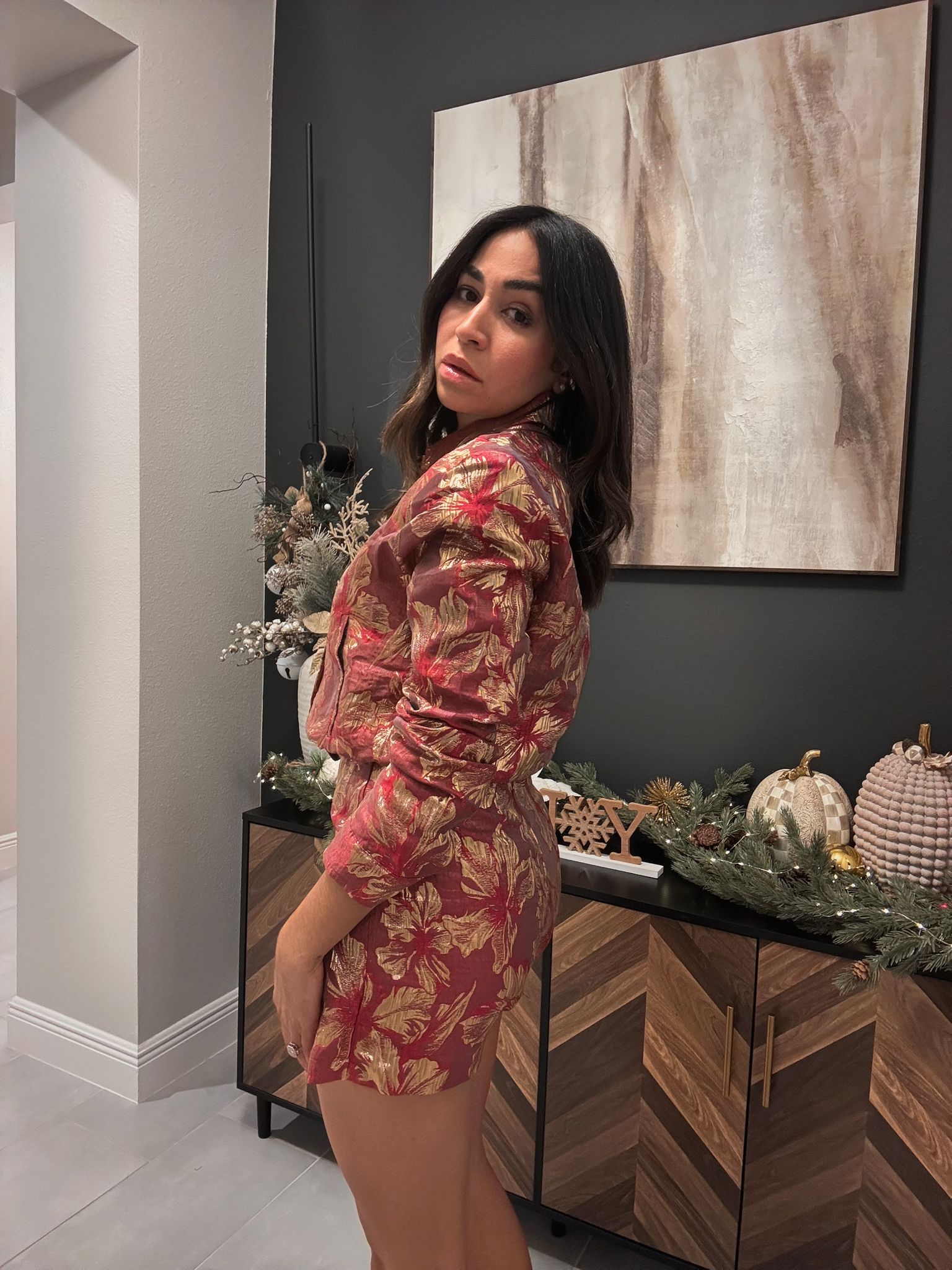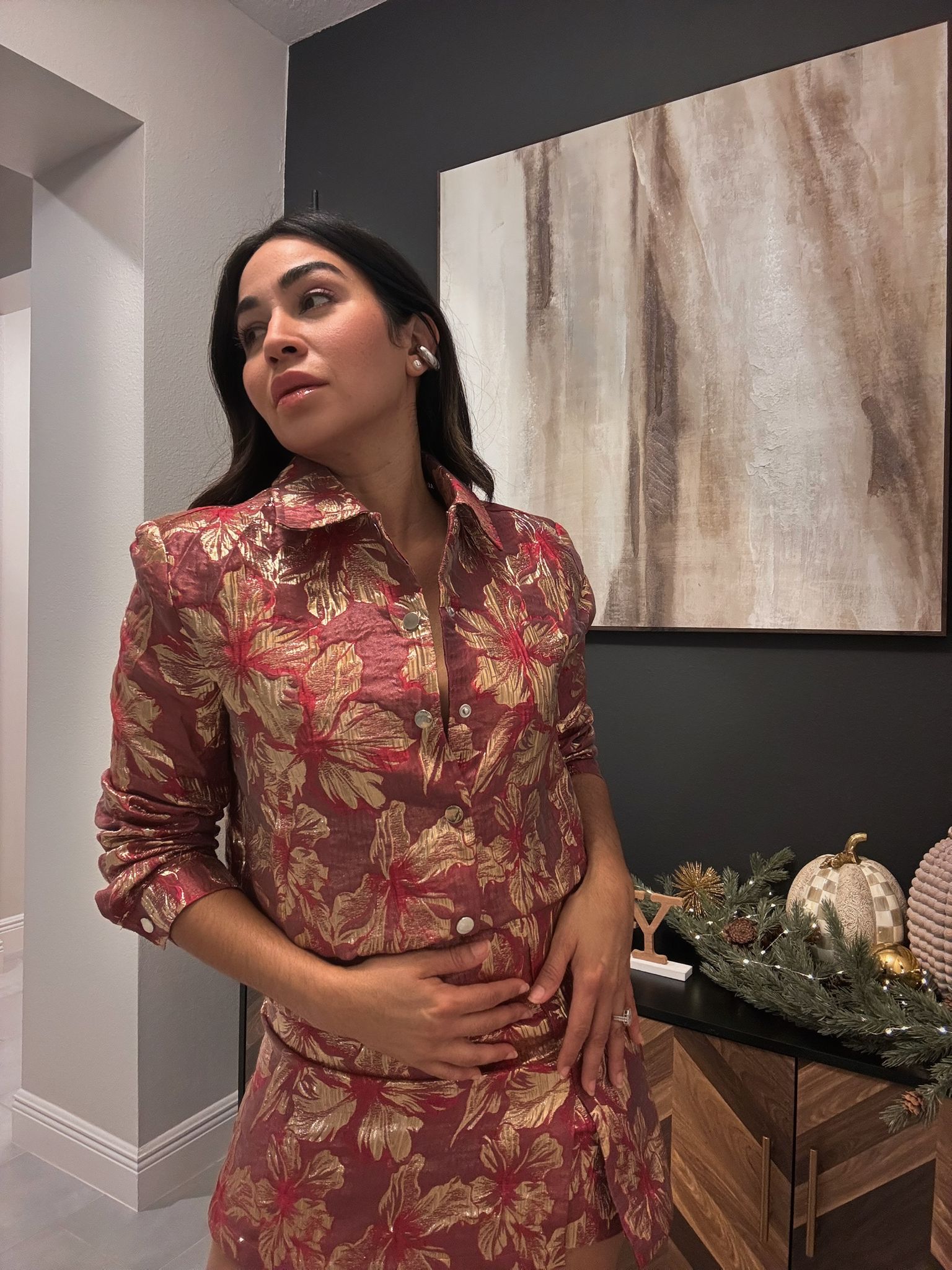 A breathtaking holiday ensemble crafted to steal every gaze. This vibrant jacket and matching skort shimmer with metallic golden leaves, creating a rich, luxurious finish perfect for the season. Bold yet elegant, the set blends festive glamour with modern sophistication. Your go-to look for celebrations where you want to make an unforgettable entrance.