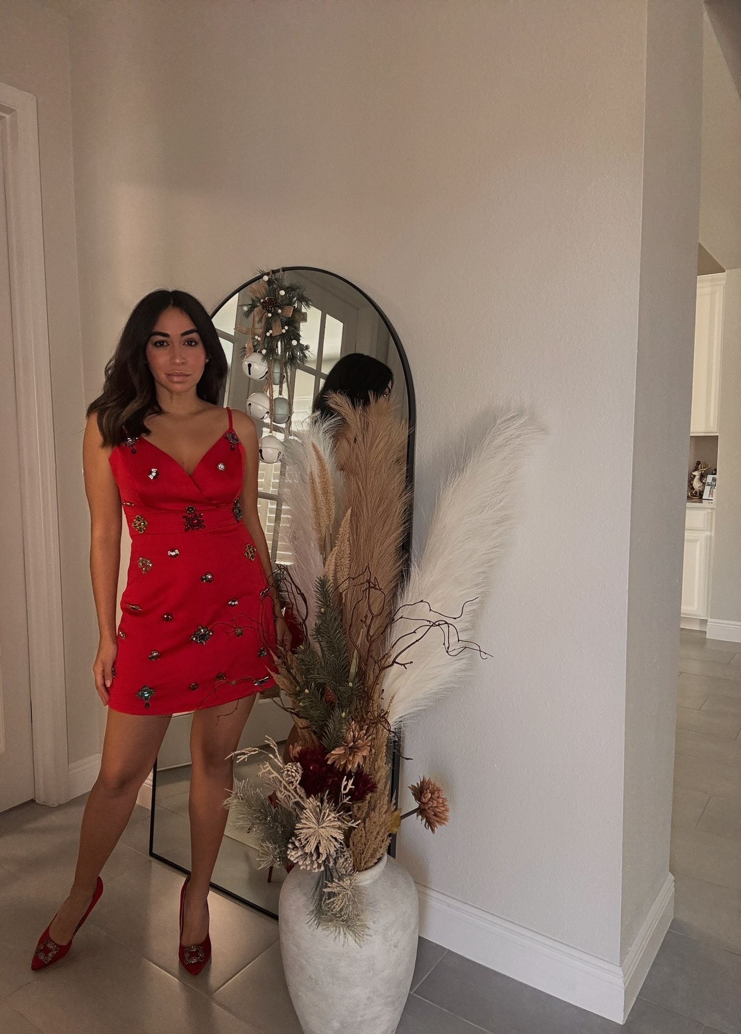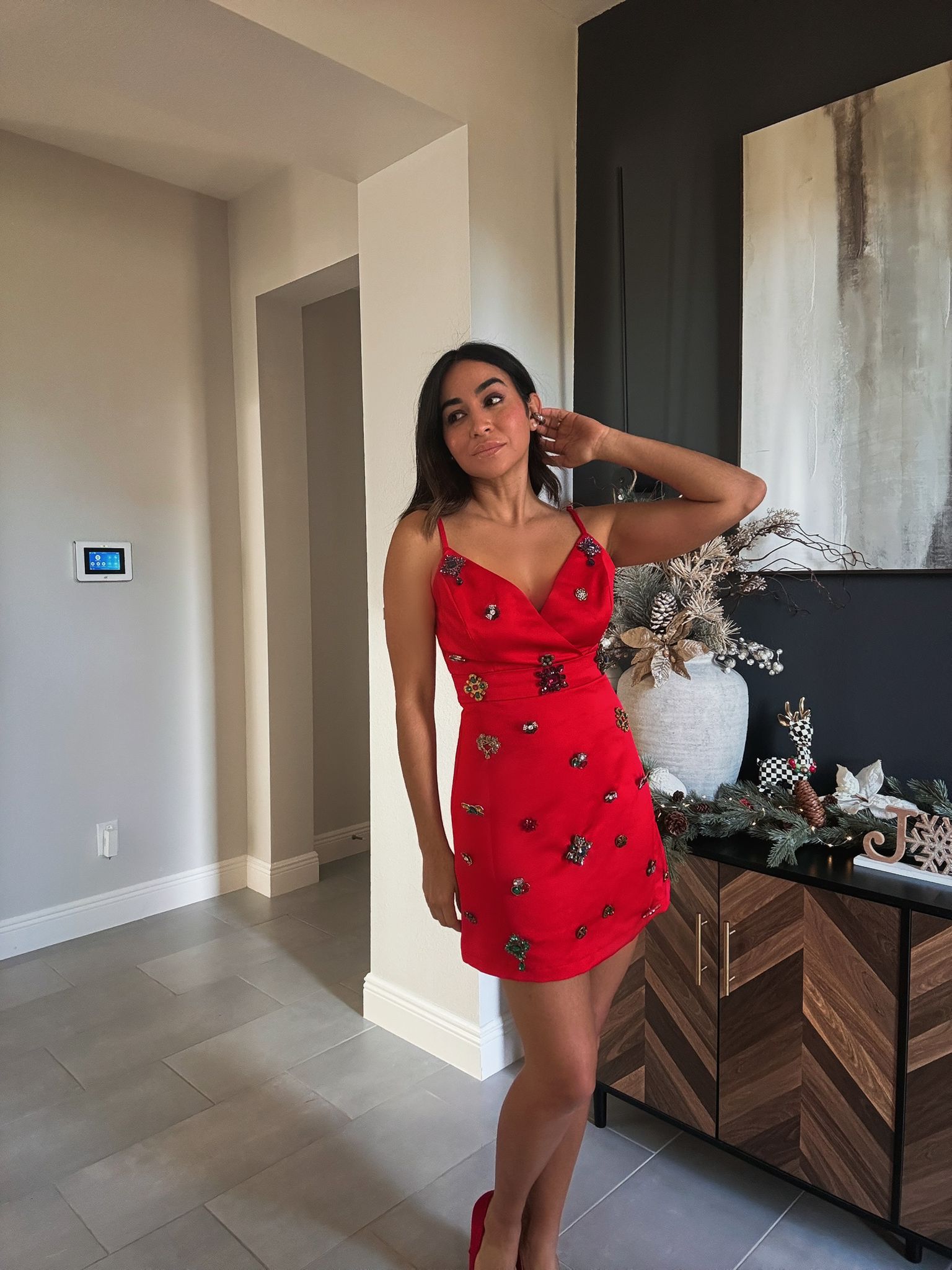 A festive show-stopper designed to sparkle with every step. This vibrant mini dress features a flattering draped neckline and delicate adjustable straps, all elevated by scattered jewel-like embellishments that catch the light beautifully. Playful yet elegant, it’s the perfect piece for holiday parties, special celebrations, or any moment you want to shine a little brighter.