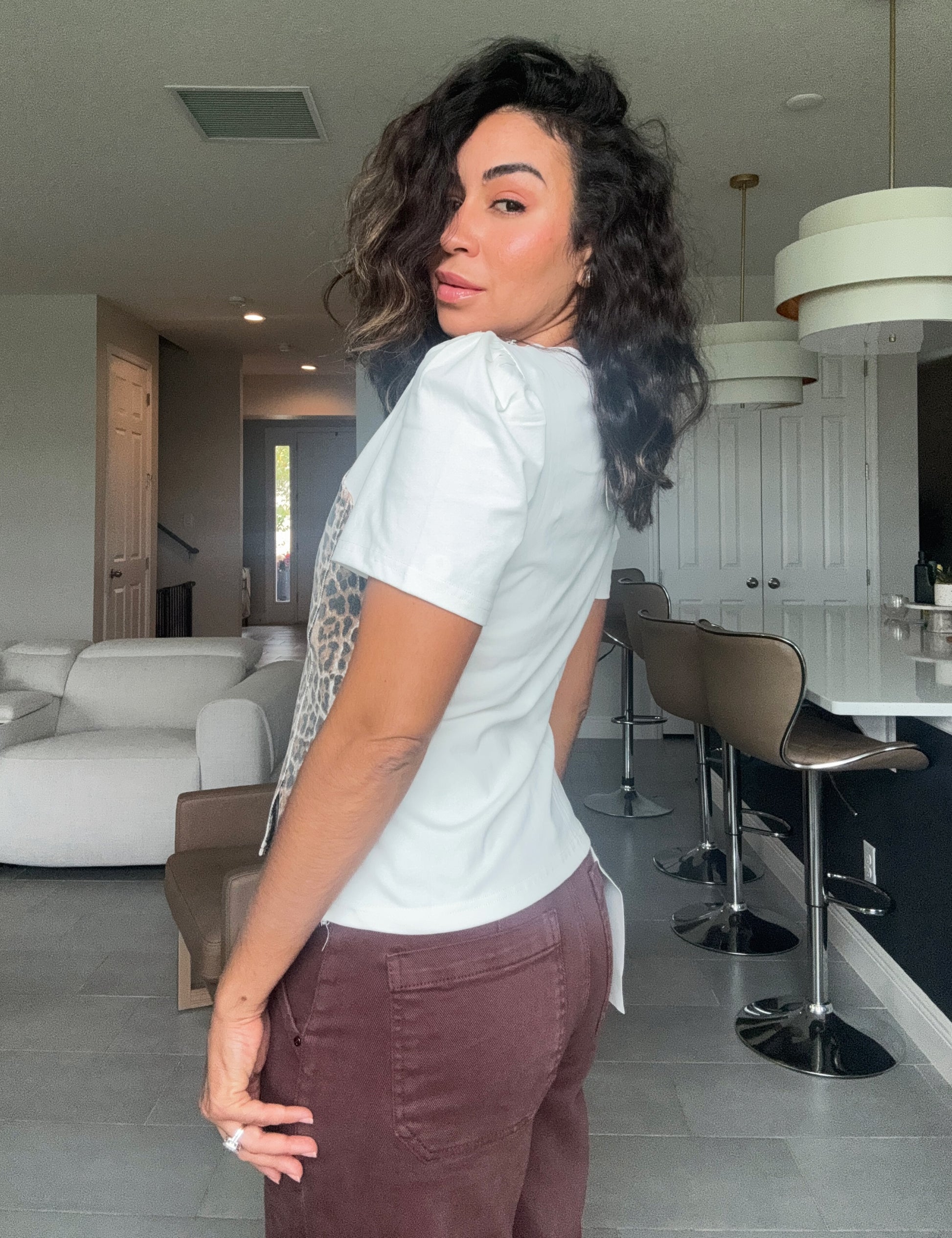 A modern essential with elevated simplicity. This structured, animal print color block t shirt features soft sculpted sleeves and a refined silhouette that transitions effortlessly from casual to statement styling. Functional zipper detail at the front with mirrors spaghetti straps. Two cut-outs details at the front. Runs true to size. Model is wearing size small. 95% polyester, 5% spandex.