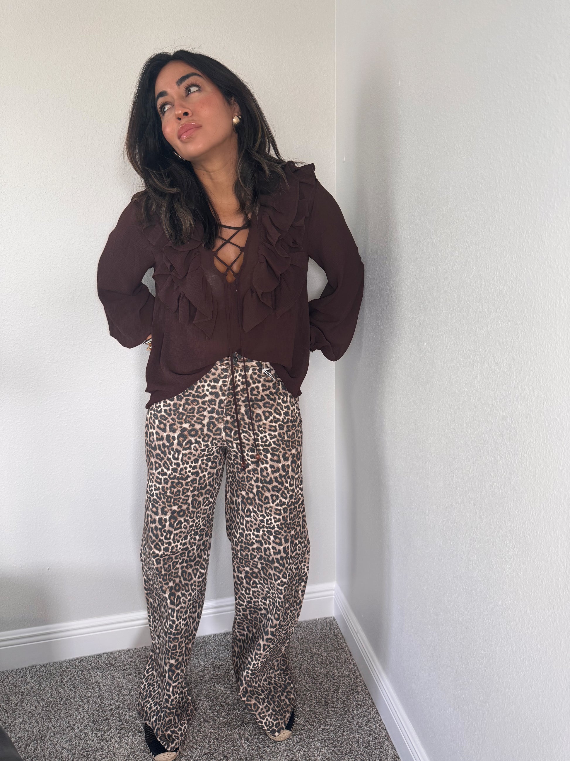 Where romance meets sophistication! The Moonlit whispers boho top features graceful long sleeves with elastic band at the end. Delicate ruffle detailing with self tie. And a flowing silhouette that moves with you. Effortlessly timeless in both white and brown, it's a statement piece that speaks softly, yet leaves a lasting impression. Model is wearing size small. Runs true to size. Loose fit.