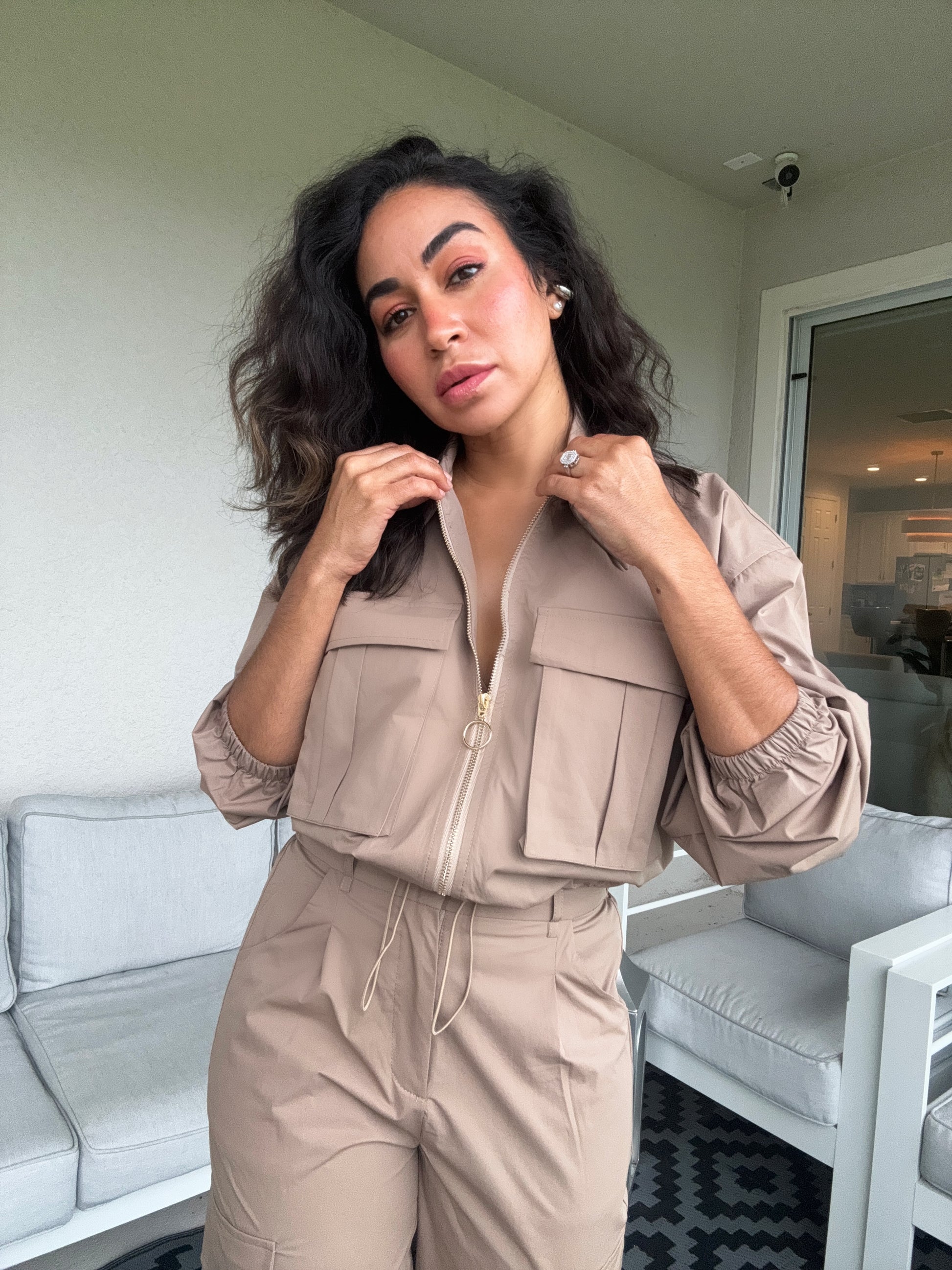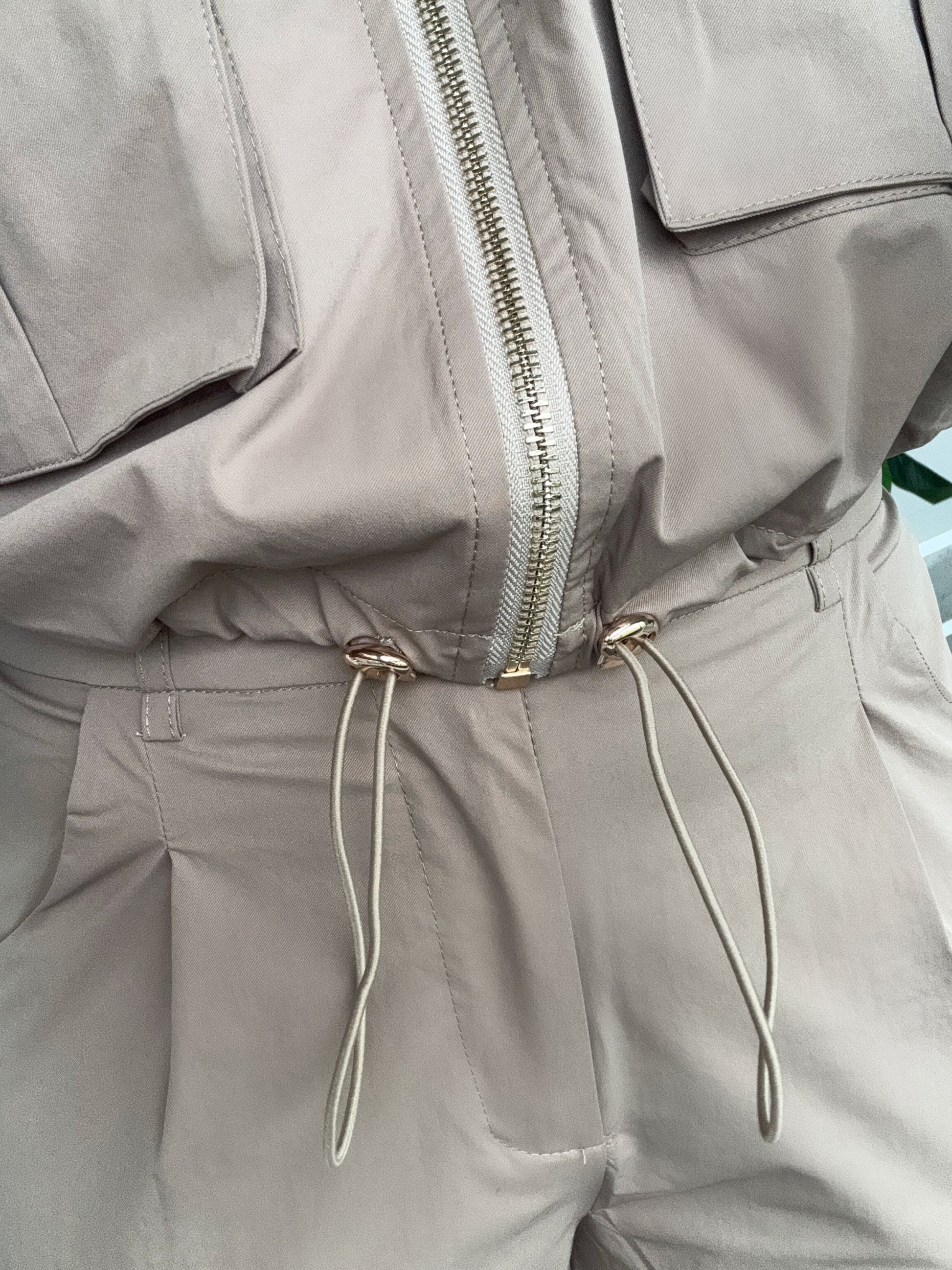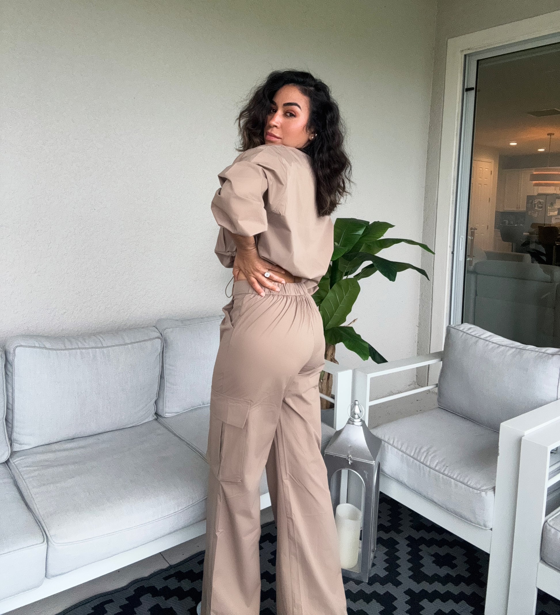 Step in style and practicality! This coordinated jacket and pants cargo combo is relaxed and yet with a structured fit. Jacket with zipper closure at the front, big cargo pockets, drawstring and elastic waist band. It also features elastic band at the end of sleeves. Pants with side pockets, cargo pockets and elastic band at the back. With pressed button closure. Perfect for city streets or weekend getaways. A contemporary edge for a look that's ready for anything. Runs true to size. Model is wearing size small. 100% polyester.