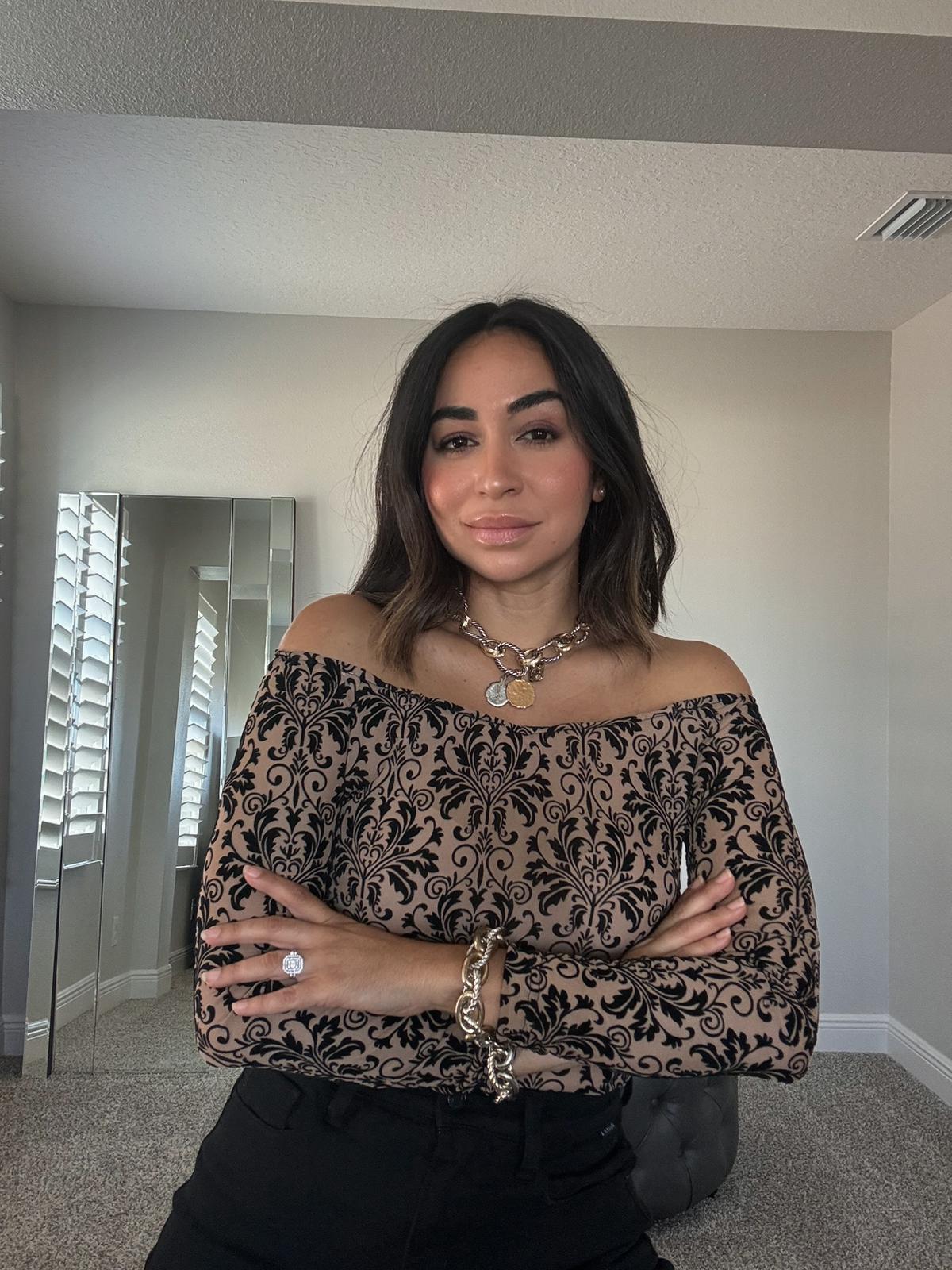 An elegant off-shoulder bodysuit that blends sophistication and modern edge. Featuring a nude mesh base adorned with black velvet baroque patterns. It hugs your silhouette with effortless grace. A feminine look that stands out day and night.